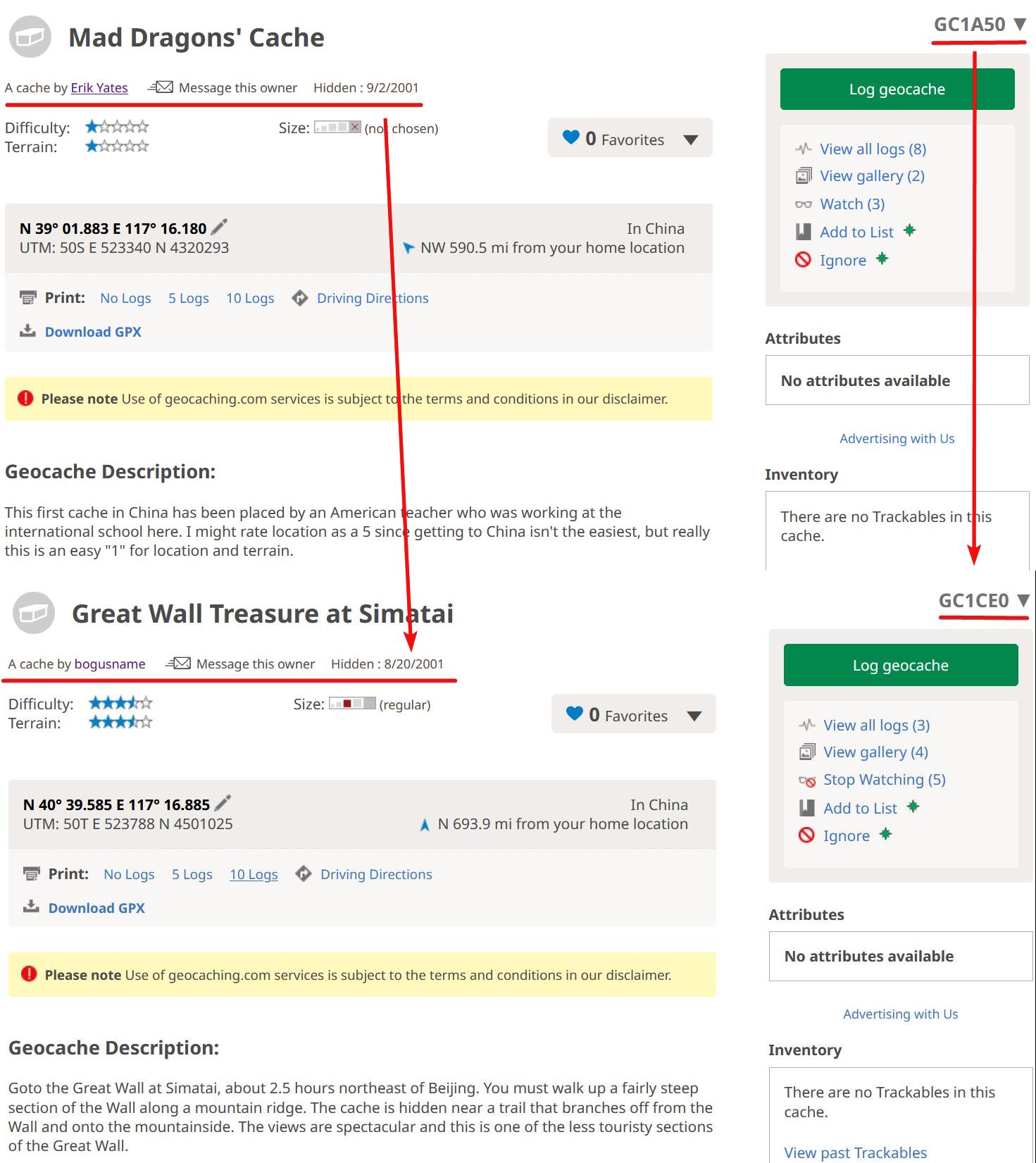 在2025年10月31日之前,根据project-gc上查询的数据,我们都认为中国最早的藏点是:Great Wall Treasure at Simatai https://www.geocaching.com/geocache/GC1CE0 (以下简称司马台)。