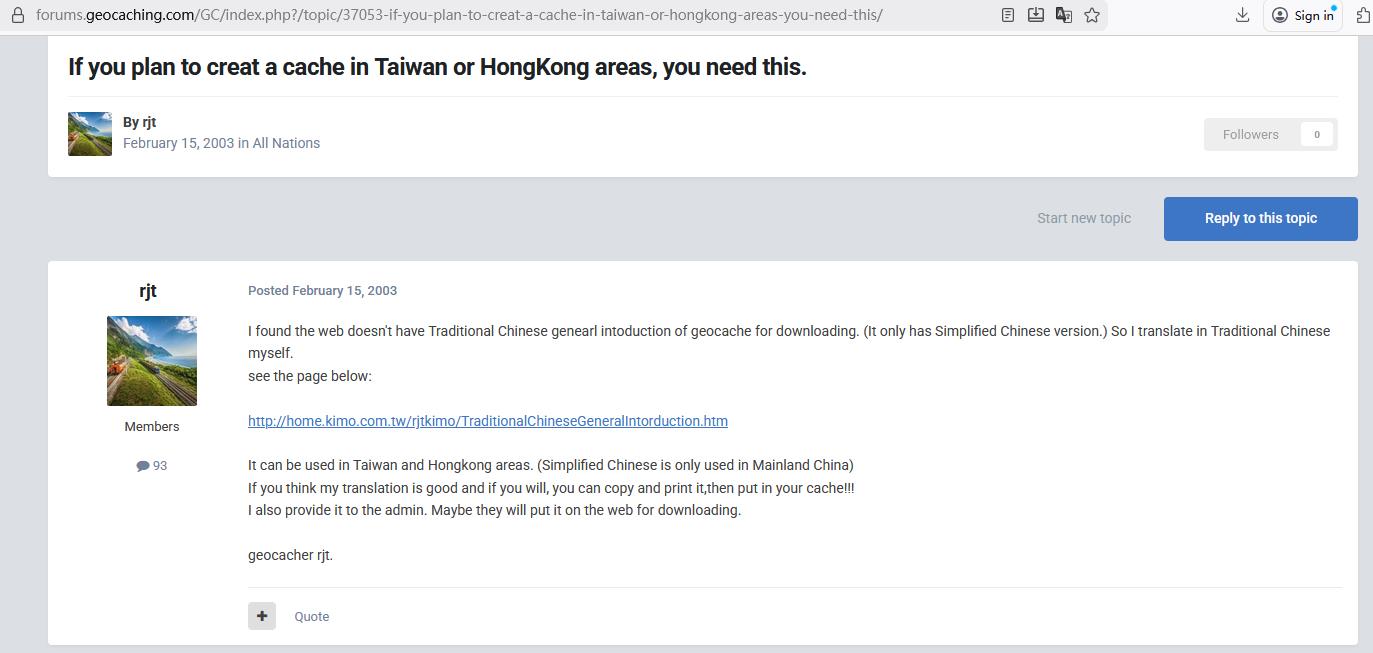 从rjt在论坛发的帖子来看,标题是如果在台湾和香港可以使用他提供的版本,那么的确存在可能是,他在2003年1月30日之前看到了官网提供的简体中文版本,然后想为繁体中文藏友们贡献一个版本。但简体中文是Savoy委托成都的同事翻译,同事对于geocaching的理解并不深刻,Savoy也不懂中文,因此rjt对简体中文的翻译做了改进,提供了繁体中文的版本。