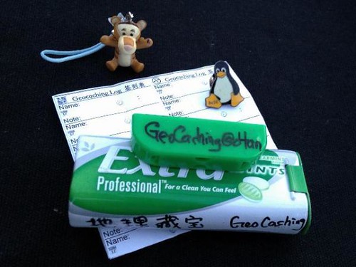 @A+M12345 也算是个老手,当然不会轻易放弃,特别是看到其他人留言里都说很容易就找到,心里当然不平衡。3/10日,他又来了,这次很顺利的找到,可是只能当老四 了。。。你就认了吧(:心胸宽广的他,居然把一直带身边两个月遨游45,000公里的旅行虫 TB4G9CC:EU Flag Micro Geocoin(上图右下角)留在#五颗钉#的宝盒里!这是一个印有“欧盟”标志的钱币款旅行虫,叫Geocoin。
