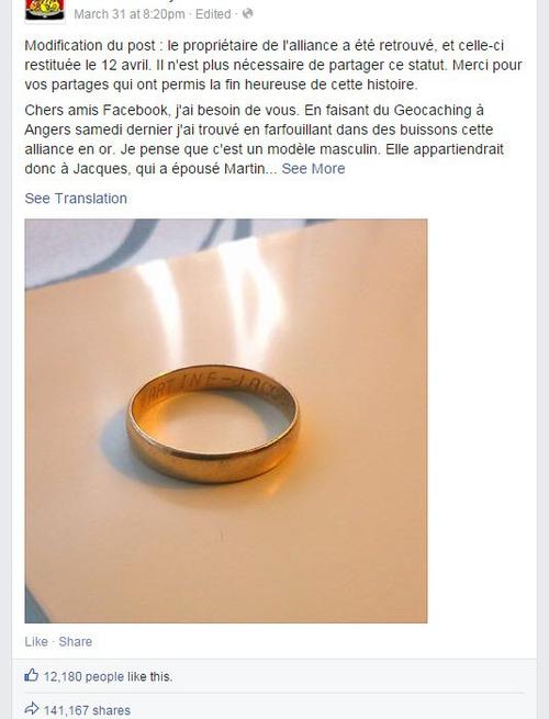 Laurent在facebook上创建这条信息时并不知道会这样,他并没有抱很大的期望,因为之前他已经联系了所有在这个藏点上发表日志的藏友联系过了。不过他还是创建了这条信息,上传了一张戒指的照片,注明是在某个藏点找到的。他把信息分享到了当地的的地理藏宝facebook社群和voilà(应该是当地的一个网站吧),这条信息在互联网上迅速传播。