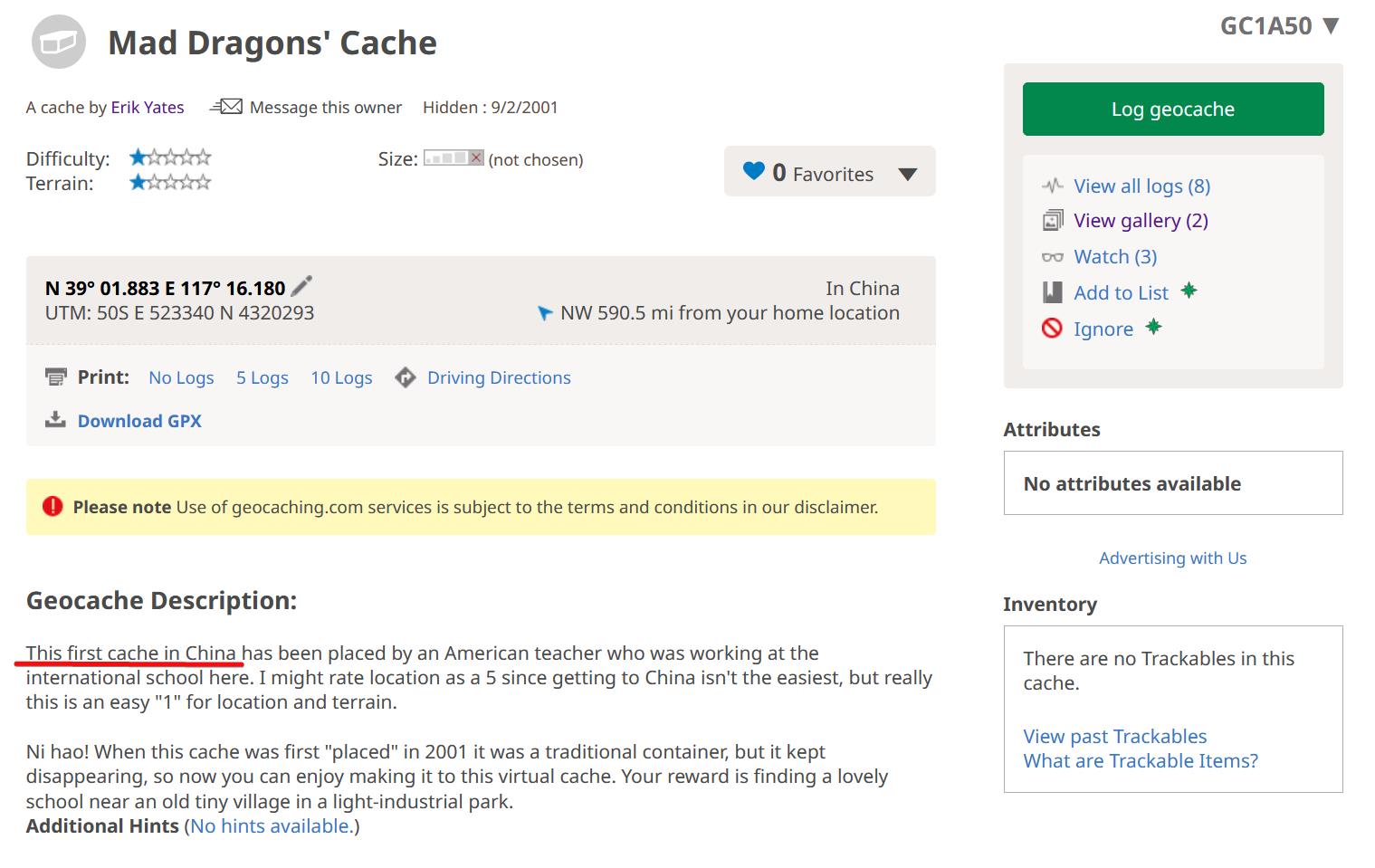 在2025年10月31日之前,根据project-gc上查询的数据,我们都认为中国最早的藏点是:Great Wall Treasure at Simatai https://www.geocaching.com/geocache/GC1CE0 (以下简称司马台)。