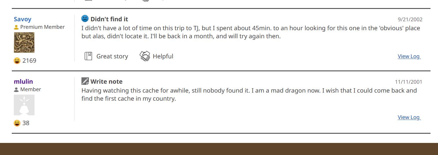 目前没有办法推测哪个藏点是先发布的,至于哪个藏点是中国的第一?各位可能都会有自己的想法,不过无论如何,这两位藏家都是在中国geocaching的先行者,可惜这两位后续都没有深入的参与geocaching,这两个藏点也是他们各自藏下的唯一一个。