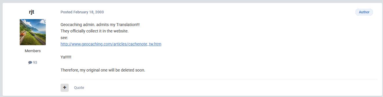 从rjt在论坛发的帖子来看,标题是如果在台湾和香港可以使用他提供的版本,那么的确存在可能是,他在2003年1月30日之前看到了官网提供的简体中文版本,然后想为繁体中文藏友们贡献一个版本。但简体中文是Savoy委托成都的同事翻译,同事对于geocaching的理解并不深刻,Savoy也不懂中文,因此rjt对简体中文的翻译做了改进,提供了繁体中文的版本。
